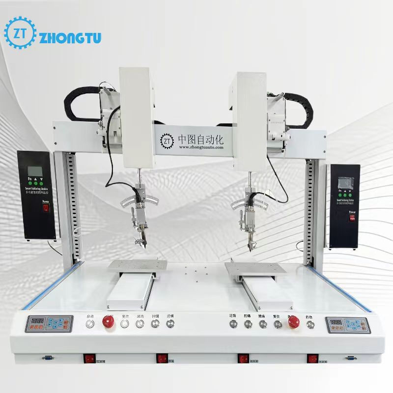 ربات لحیم کاری اتوماتیک پیشرفته طراحی شده برای کاربردهای لحیم کاری دقیق در کارخانههای تولیدی، فرآیندهای SMT و DIP. دارای دو سر لحیم کاری و محور چرخش برای انعطافپذیری و بهرهوری بیشتر.