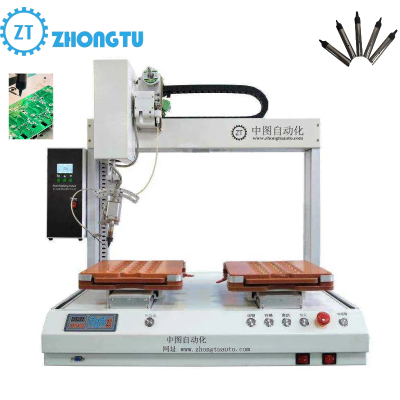 Advanced automatic soldering robot designed for precision soldering applications in manufacturing plants, SMT, and DIP processes. Features dual soldering heads and rotation axis for enhanced flexibility and productivity.